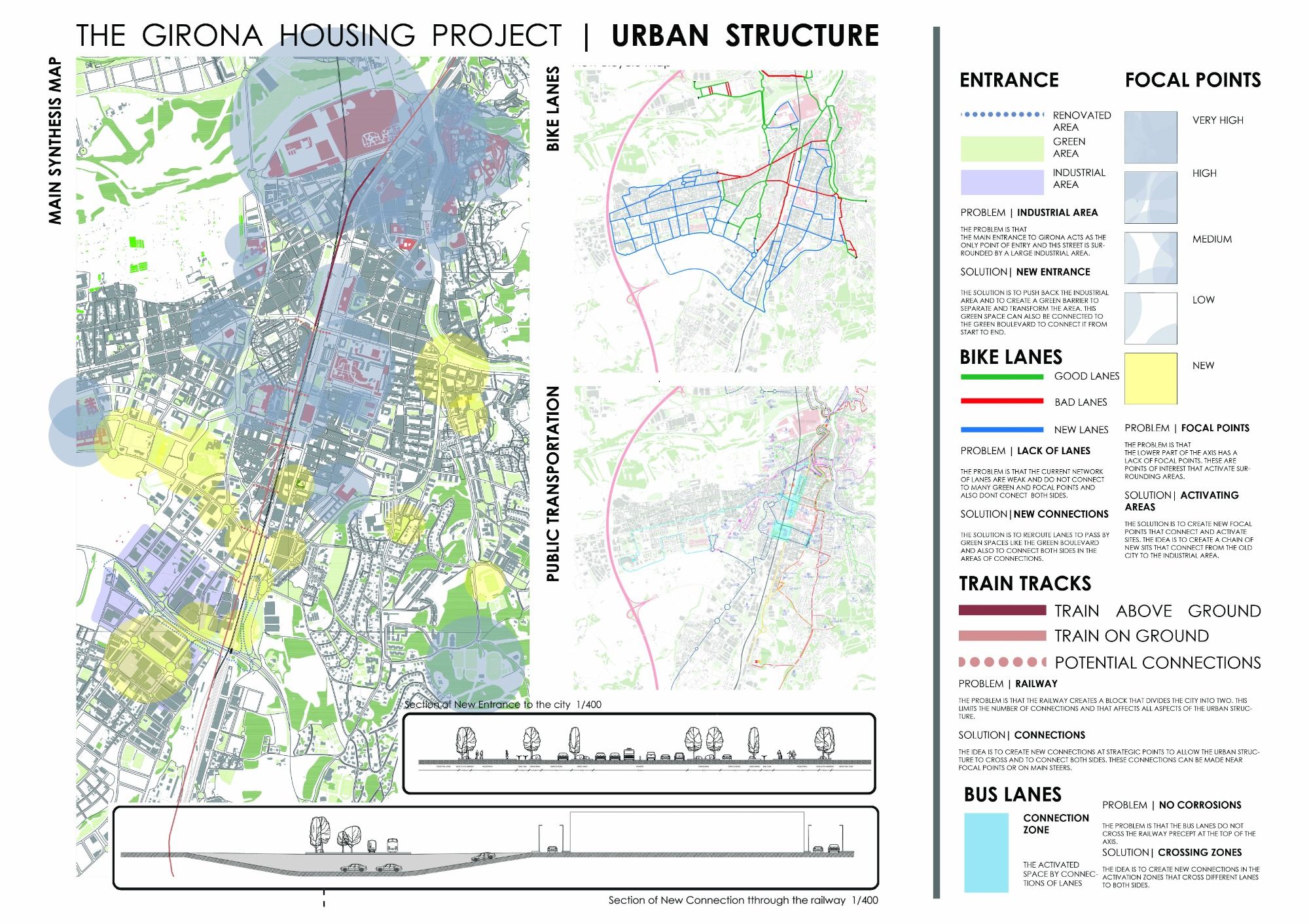 Was a deep urbanistic study of the fabric of the city of Girona, where an extensive mapping analysis was done to evaluate the strengths and weaknesses along the main connective Rd of the city. After selecting an area eligible for improvement, an urban restructuring was created with a deep development of public, commercial, and housing spaces following the urban guidelines of this state.